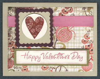 I used river rock, chocolate chip, very vanilla, old olive, and basic grey infuse pp. Sentiment is from Stampendous and was inked with ruby red and sponged with close to cocoa. The old olive piece was distressed with my distressing kit from SU. The heart was stamped with versamark and then topped with New England Autumn hand blended ep from The Powder Keg. The embossed heart is really shiney IRL. The ribbon is Regal Rose gg from SU.
