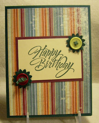 The birthday greeting stamps are just misc stamps that I have picked up over the years. I used the Weathered bg stamp and some paper that was hanging around in my scrap bin. I think some of it is Basic Grey, but don't hold me to that. These are pretty basic and straightforward, but I like them.