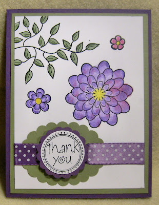 I love this stamp set from There She Goes called Flowers of Happiness - it is so gorgeous! I've been wanting to try paper piecing and also to use my Koh i Noor pencils and I did both on these cards. The sentiments are from Hero Arts and Stampin' Up! and the paper for the card base is Plum Pudding from PTI. The first layer is Mellow Moss from SU and the top is Whisper White from SU. Ribbons are from both SU and PTI as well. The patterned paper on one of the flowers is also from PTI and coordinates with the Plum Pudding. These cards were lots of fun to make. What do you think of them?